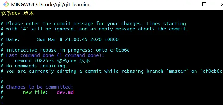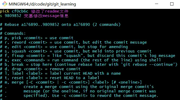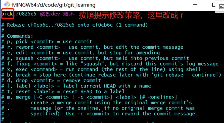 git rebase -i 要变更的commit版本号 // 变基,修改以往 commit 的 message 信息1、变基后出现如下弹窗,修改版本号前面对应的命令,pick -> reword