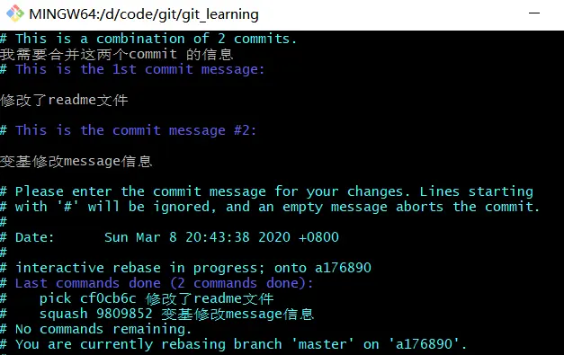 git rebase -i 要合并到最早commit版本号 // 合并版本号 message1、变基出现出现如下弹窗,修改第二行要合并到最早的 commit 版本前面的命令为 squash