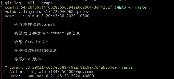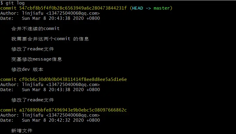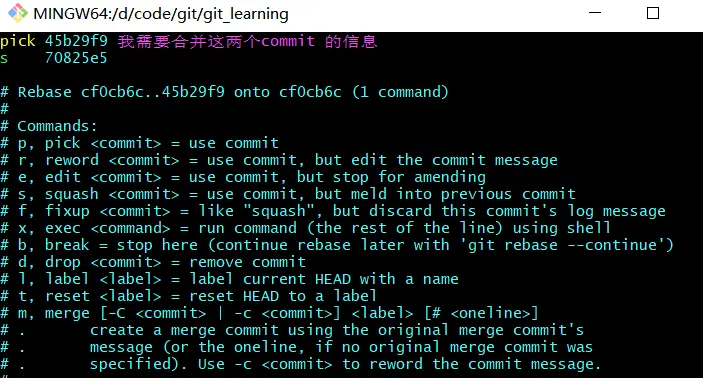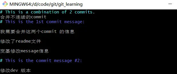git rebase -i commit版本号1、变基之后再弹窗中添加不连续的 commit 版本号 , 除了第一个策略为 pick,其他修改为 s,如下面 70825e5 对应的就是要合并的不连续的 commit 了