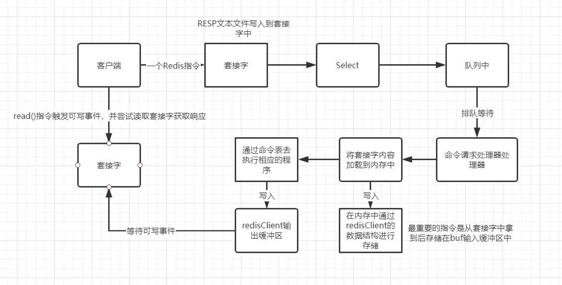 (1)当一个客户端的请求信息已经被写到相应的被监听的套接字文件中之后,会产生一个AE_READABLE事件,然后会将该事件放入等待队列中,等待处理命令的线程处理完当前事件,文件事件分配器会为队头套接字分配文件事件,使用在上个阶段注册的命令请求处理器进行处理: