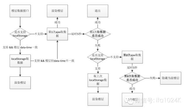 第一次ajax请求数据时,会延时5秒,查看请求是否成功,如果成功则退出,如果失败:首先会取上次localStorage数据做垫底数据,但浏览器如果不支持localStorage, 基于高可用性原则考虑会进行第二次ajax请求数据,如果第二请求成功则正常渲染和localStorage楼层,如果第二次请求失败,此时极大可能说明网络存在异常,这时为了保持良好的用户体验,不能留有空白,直接隐藏当前楼层。