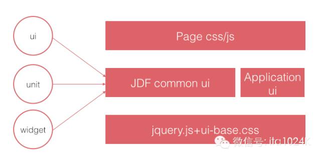 第二层是JDF公共组件,包括UI组件、Unit业务组件、Widget模块,这些组件包括event,localStorage,焦点图,动画,地区选择,对话框,下拉菜单,懒惰加载,suggestion,login,search,category,cookie等常见交互组件和业务组件;同时也有当前业务级需要的公共组件,比如楼层懒加载组件,楼层切换电梯组件等。