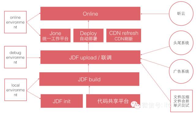 本地新建项目,调用线上模块云相关widget,本地使用JDF工具进行编译,联调,输出,上线时使用线上JDF进行打包,发布至CDN,最后清静态文件缓存。