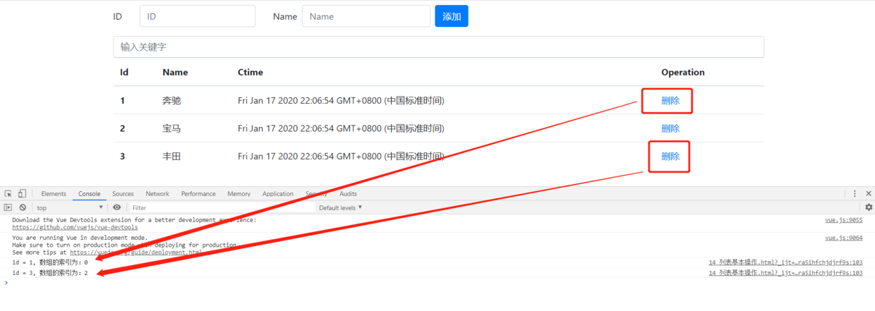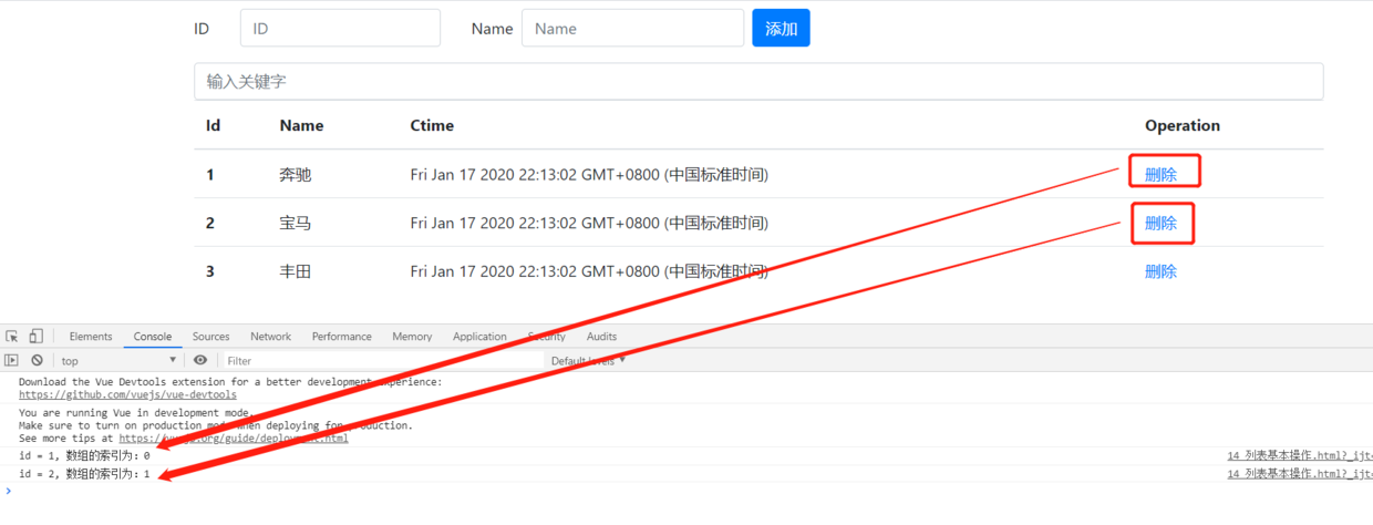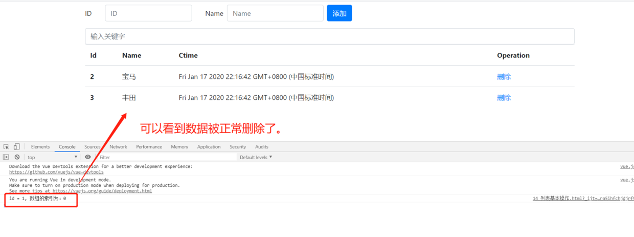 在浏览器中点击删除按钮,查看打印的数组索引,如下: