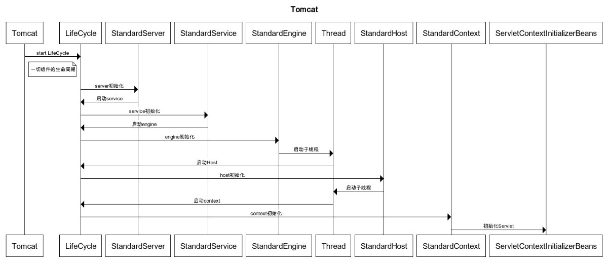 - 可能大家对Tomcat不太熟悉的人对这种跳跃性难以接受(其实是我自己也看不下去了,但作为第一次写博,希望大家稍微谅解下哈),在此给大家画个时序图&贴栈信息的情况供大家粗略了解下