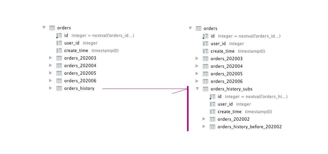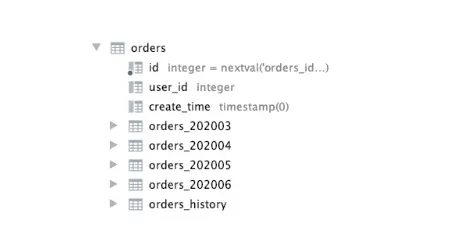 原有的 orders 分区表成了下图结构: