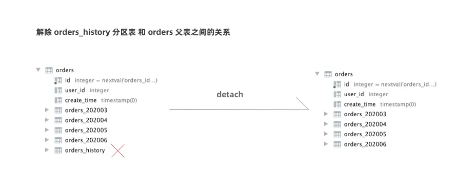 解绑完成之后,可以看到 orders_history 不再是 orders 的分区表。
