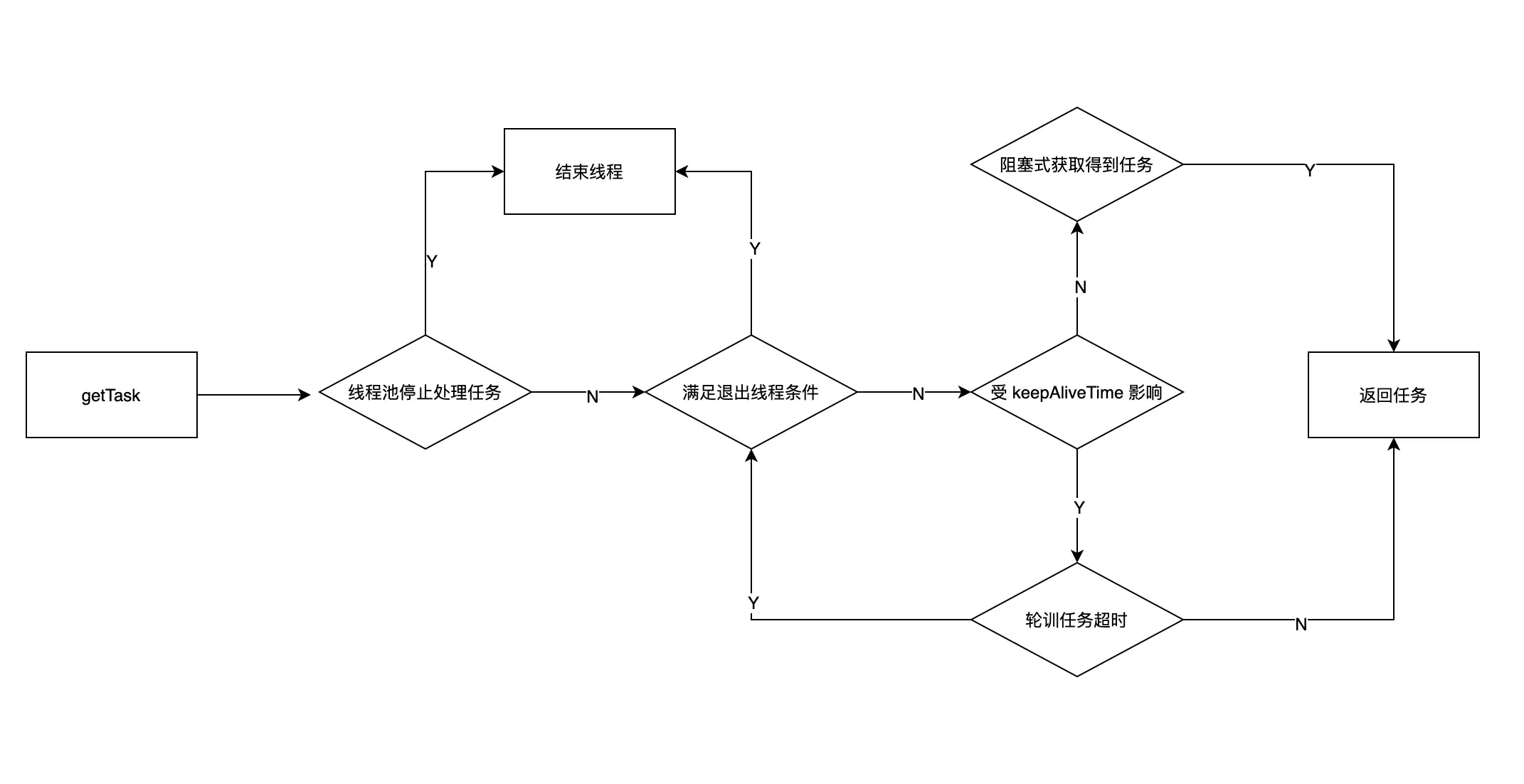 - 如果不受 keepAliveTime 影响,则直接阻塞式获取任务,直到队列中存在任务,则返回该任务,以此来达到线程的复用