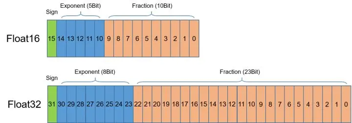 顾名思义,自动混合精度是一种自动将半精度和单精度混合使用,从而加速模型训练的技术。其中单精度(Float Precision32,FP32)好理解,是计算机常用的一种数据类型。那么半精度是什么呢?如图1所示,半精度(Float Precision16,FP16)是一种相对较新的浮点类型,在计算机中使用2字节(16位)存储,在IEEE 754-2008中,它被称作binary16。与计算中常用的单精度和双精度类型相比,Float16更适于在精度要求不高的场景中使用。