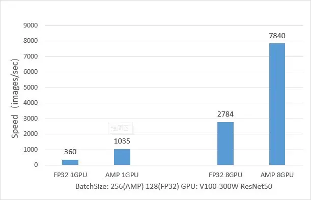 飞桨AMP技术在ResNet50、Transformer等模型上训练速度相对于FP32训练来说有非常大的优势,下面以ResNet50模型为例,从下图中可以看出,ResNet50的AMP训练相对与FP32训练,单卡加速比可达2.9倍,八卡加速比可达2.8倍。