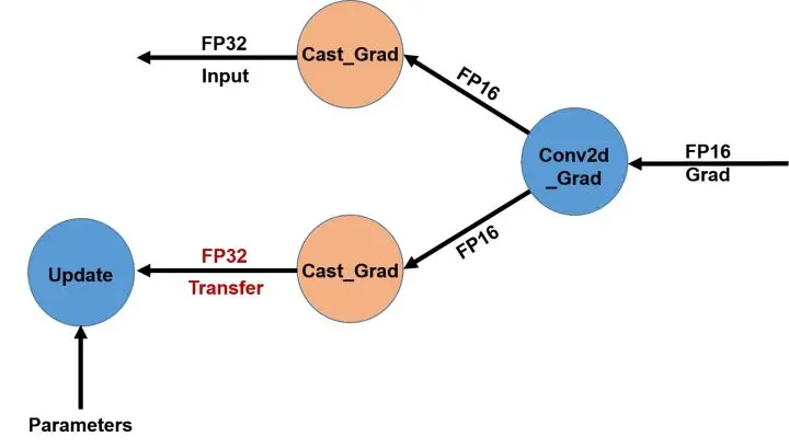 为了降低GPU多卡之间的梯度传输带宽,我们将梯度传输这个过程提到Cast操作之前,而每个GPU卡在得到对应的半精度梯度后再执行Cast操作,将其转变为单精度类型,如图3所示。这一优化在训练网络复杂度较大的模型时,对减少带宽占用方面非常有效,如多卡训练BERT-Large模型。
