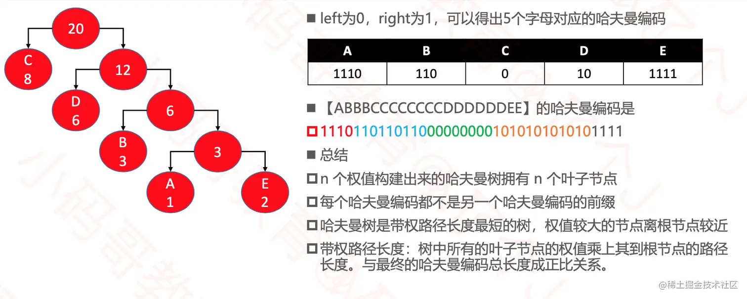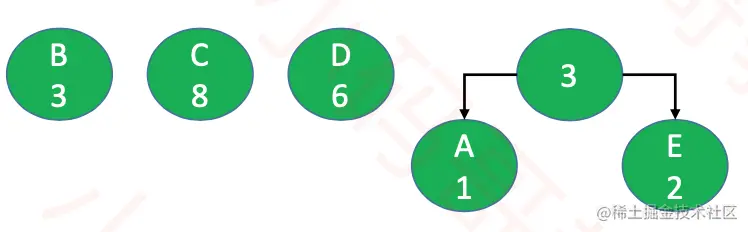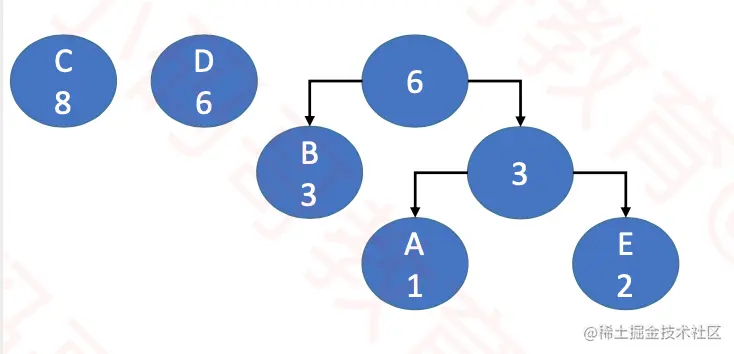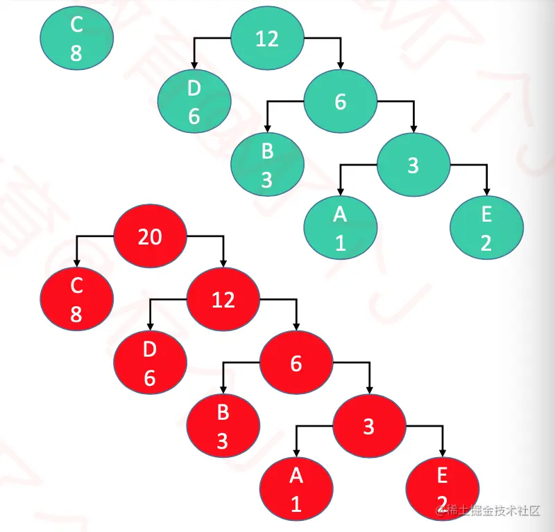 - 重复2,3步骤,直到森林只剩一棵树为止,该树即为哈夫曼树。