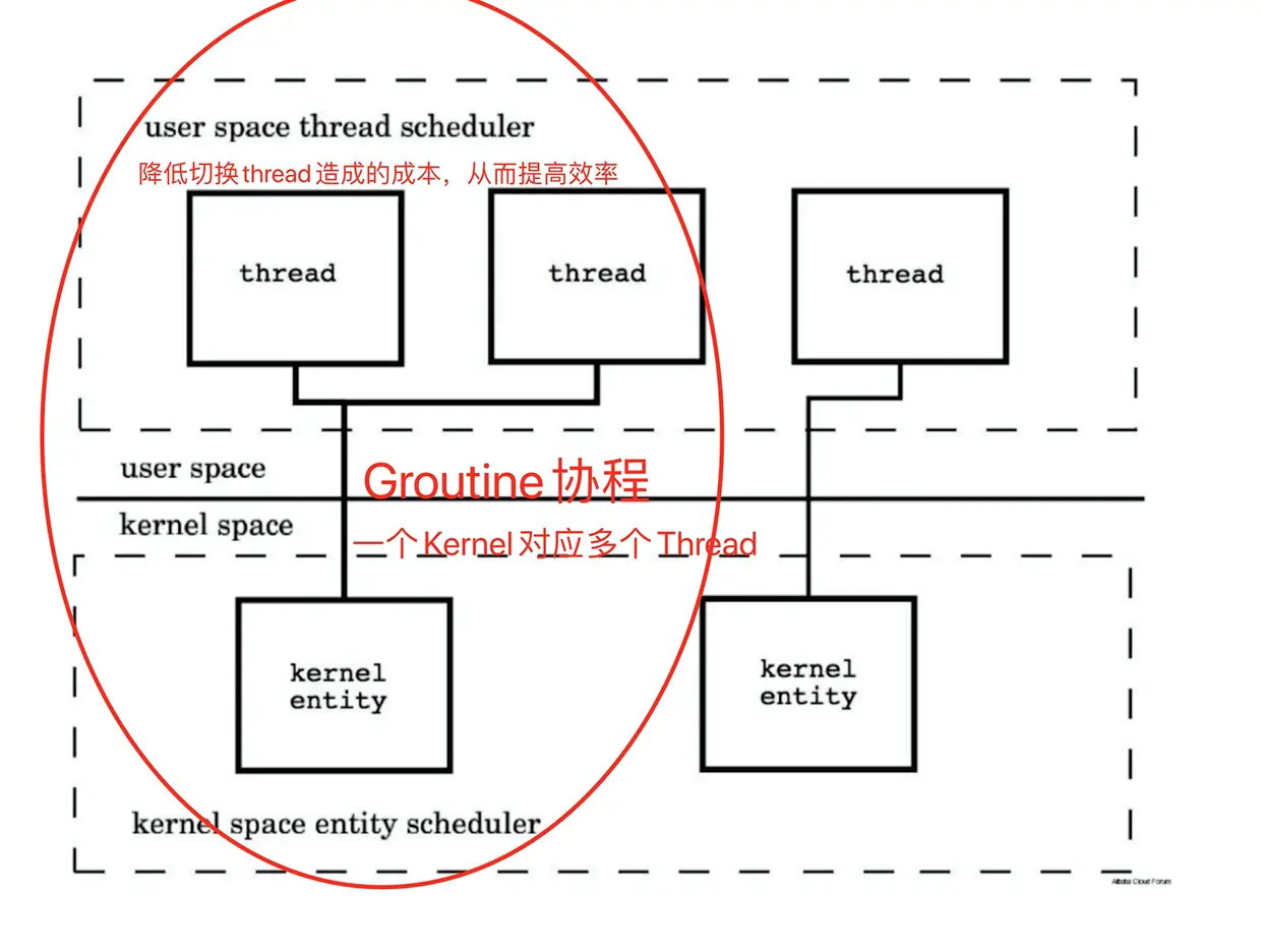 kernel entity)的切换,这会造成较大的成本。 - 而多个协程在同一个系统线程(