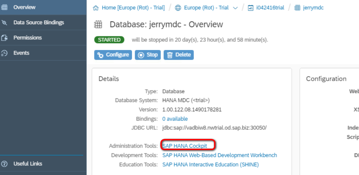 待该实例中状态为STARTED之后,我们就可以点击SAP HANA Cockpit进入控制台了: