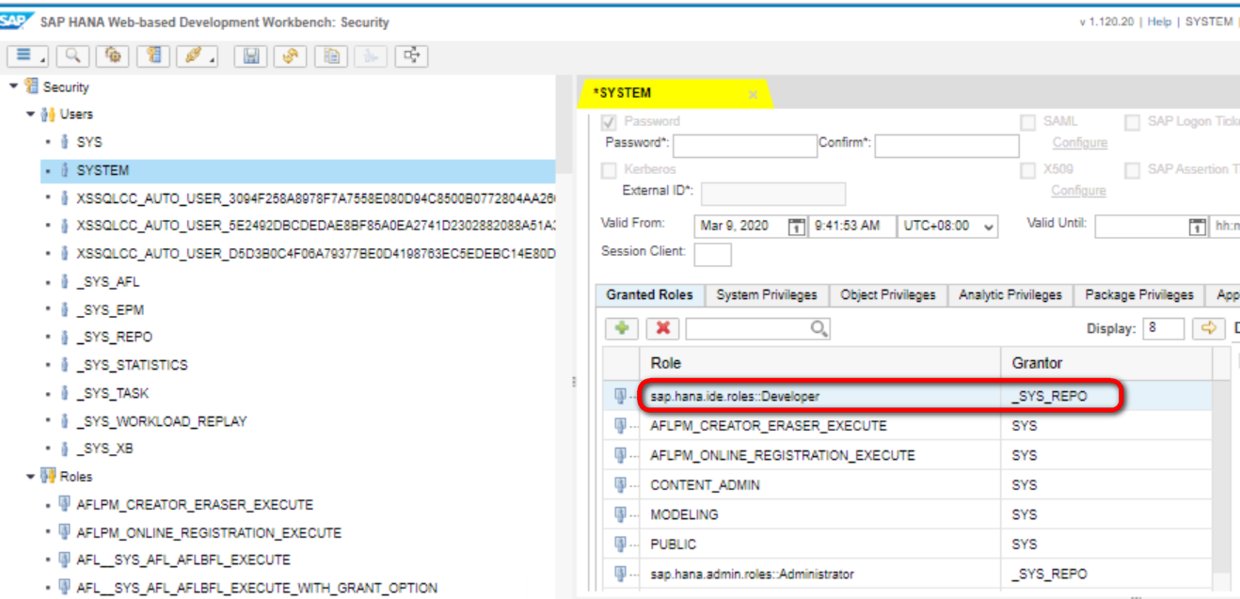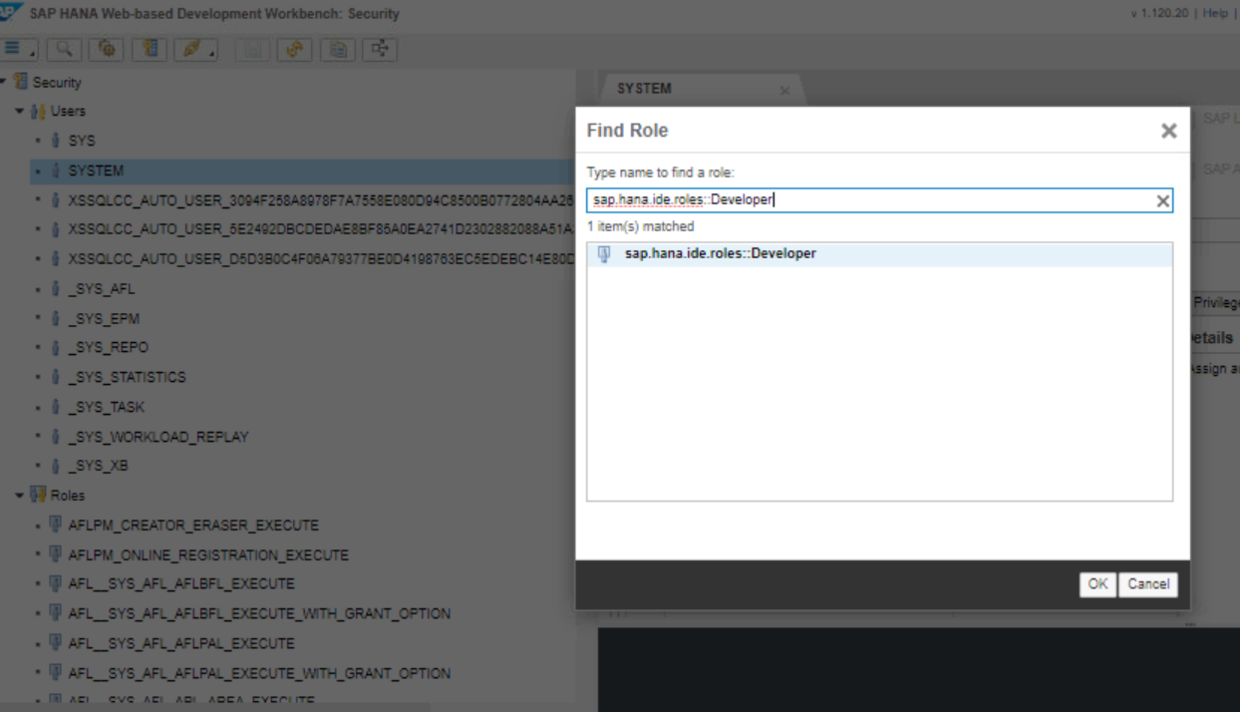 将sap.hana.ide.role::Developer role添加给SYSTEM用户: