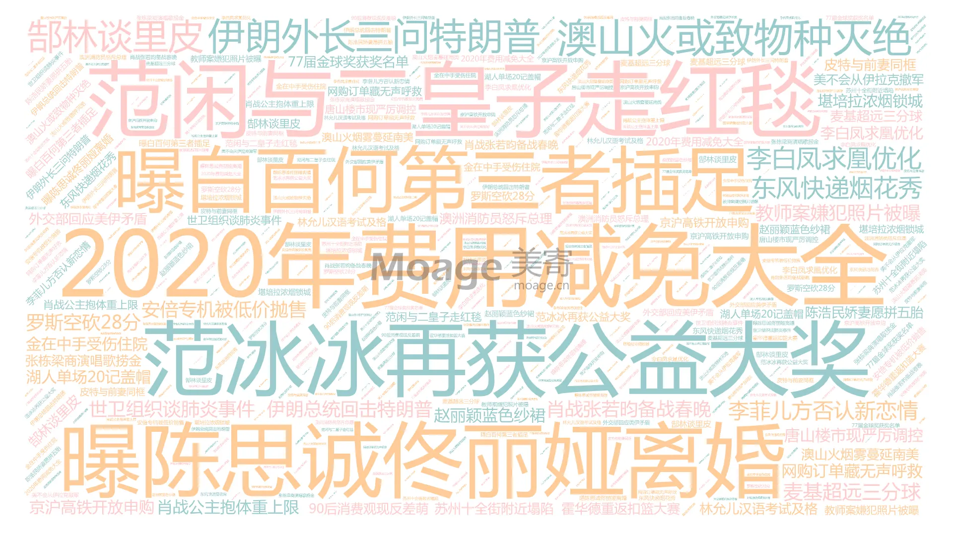 我们读到的热词数据总共有60多条,60条数据生成的云图太单调了,那么我这边记录了近3天来的数据,总共是264条数据。我们将这264条数据放到云图中会是怎么样的呢?