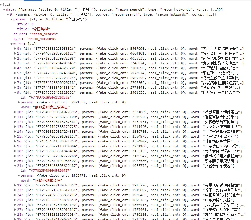 通过浏览器的network功能,我们很方便的就会看到,在这个页面获取热搜词的时候,调用了一个接口,那么我们获取热搜词的时候也可以调用,这里不方便将接口直接放出来,有需要的可以进入热搜榜提取接口地址。