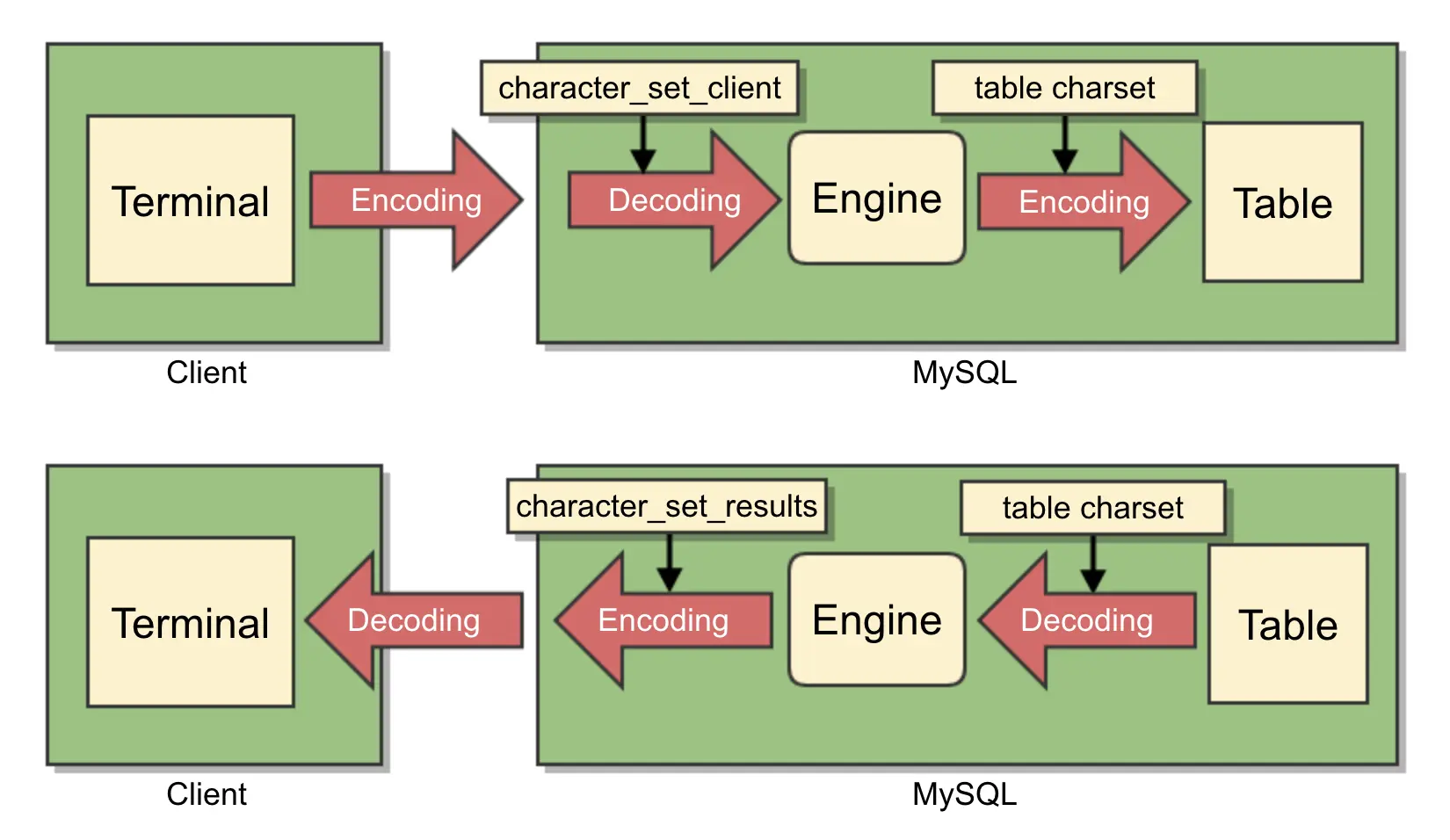 在客户端将一条命令输入MySQL时,MySQL只知道这条命令是0101的字节流,并不知道具体采用的是什么编码。第一个参数character_set_client就告诉了MySQL,这条命令是UTF-8编码,于是MySQL会使用UTF-8解码字节流。当MySQL成功解码以后,会将命令内容转化为目标表格的编码。