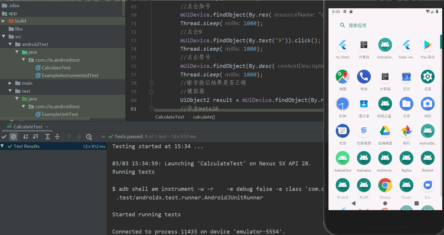 UI Automator属于运行在手机端,所以去项目中找到app/src/androidTest目录,在这里面就可以编写UI Automator的测试代码了。新建一个测试类CalculateTest