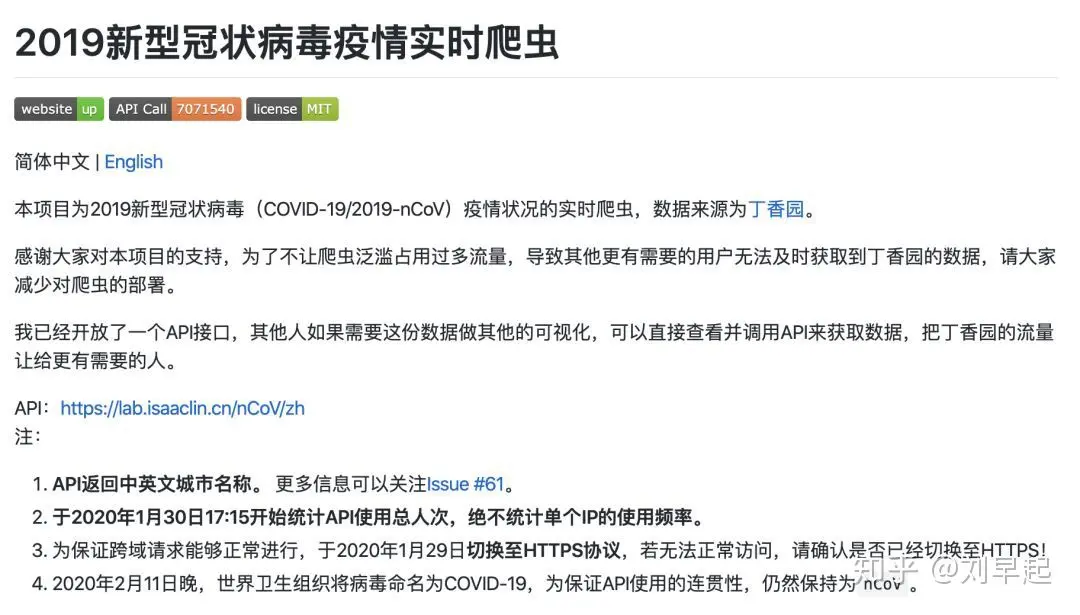 疫情数据获取并不是很难,在目前互联网上已经有许多提供数据的网站,比如丁香园、腾讯新闻、百度新闻等,为了省事直接GitHub上找找看有没有现成的接口,很轻松就找到了丁香园数据的API,