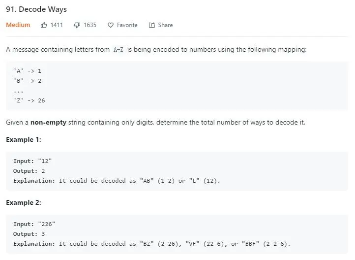每个数字对应一个字母,给一串数字,问有几种解码方式。例如 226 可以有三种,2|2|6,22|6,2|26。