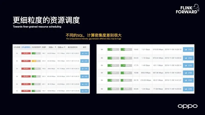 目前,OPPO 是基于 YARN 做 Flink 的集群调度,而 YARN 的调度是基于 VCore 以及内存维度实现的。在线上运行时就发现一些机器的 CPU 利用率很高,另外一些却很低,这是因为不同的 SQL 处理的复杂度以及计算密集度是不同的,如果还是和以前一样分配 VCore,那么很可能导致对于资源的利用率不同,因此未来需要考虑将 SQL 对于资源的调度加入到考虑范围内,尽量避免资源的倾斜。