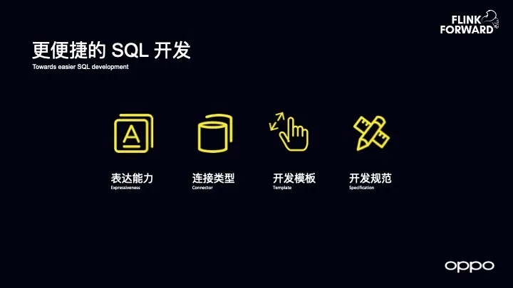 因为 OPPO 现在的实时数仓是基于 SQL 做的,所以在未来希望能够具有更好的、更便捷的 SQL 开发能力,总结来下就是以下四点: