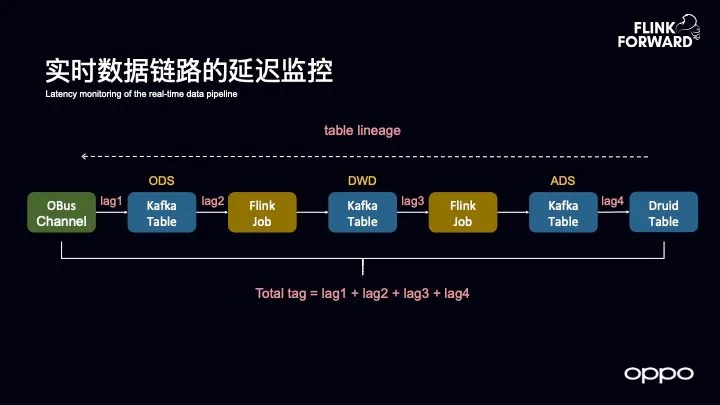 因此, OPPO 也实现了全链路的延迟监控,从接入的通道开始到每一层的 Kafka 消费,都将其 lag 情况汇总起来,探索到每一级的 Flink SQL 表的血缘关系。有了这样的血缘关系之后就可以从 Druid 表推导到前面所接入的链路是哪一个,然后将总体延迟加起来,这样就可以反映出整体链路的延迟情况。