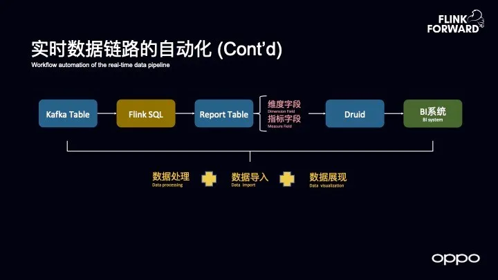 上述链路中的数据处理、数据导入和数据展现三个环节是比较割裂的,因此需要三种不同角色的人员来介入做这件事情,因此 OPPO 希望能够打通实时数据链路。OPPO 做了如下图所示的实时数据链路的自动化,对于 Kafka 的表做了抽象,而对于用户而言,其就是用于做 BI 展示的表,Kafka 的表需要定义哪些是维度、哪些是指标,这是做报表展示最基本的字段定义。