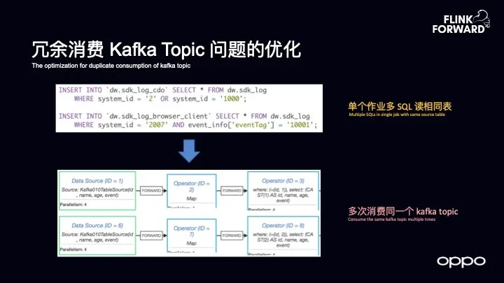 在 OPPO 的场景下,我们发现了自己所存在的一个很棘手的问题,那就是很多用户在写 SQL 的时候会出现同一个作业需要写多个 SQL,比如刚才提到的接入场景,如果想要做通道的拆分,通常而言需要来自同一个表格,经过不同的过滤,然后导入到不同的数据表里面去,而 OPPO 希望在单个作业中就能够实现这样的表达。