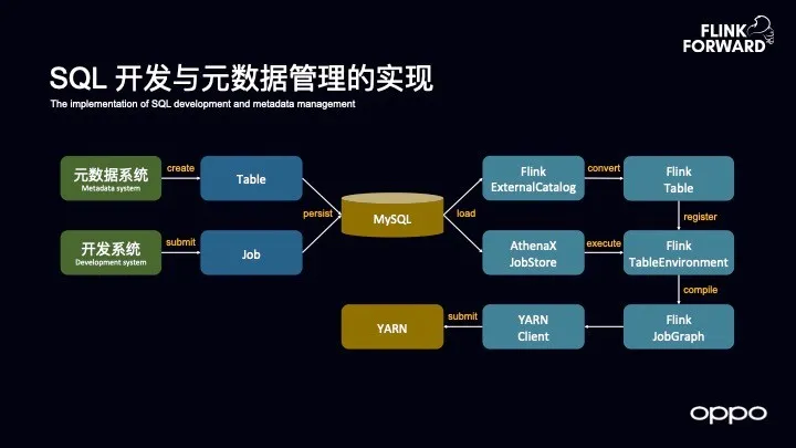 想要做实时数仓所需要的第一步就是支持 SQL 的开发与元数据管理的实现。OPPO 在这部分的设计大致如下图所示。
