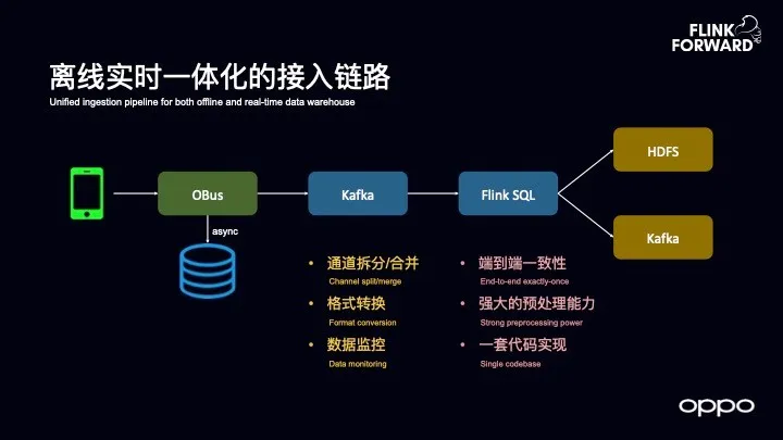 首先为大家介绍离线实时一体化接入链路,OPPO 的数据从手机端到 OBus 内部数据收集服务,收集之后会统一落入到Kafka中去,再通过 Flink SQL 的任务可以同时落入 HDFS 和 Kafka 中去。Flink 可以实现数据通道的拆分,对于 OPPO 这样一个手机公司而言,很多 APP 上报都是通过同一条通道,因此在将数据落入到数仓之前需要对于数据通道进行拆分,根据不同的业务和属性做一些拆分,除此之外还会做一些格式的转换。另外一部分功能就是实现数据的监控,因为将数据落入到 HDFS 时需要有一个很重要的问题就是分区感知问题,比如离线 ETL 任务如何知道分区已经结束了。