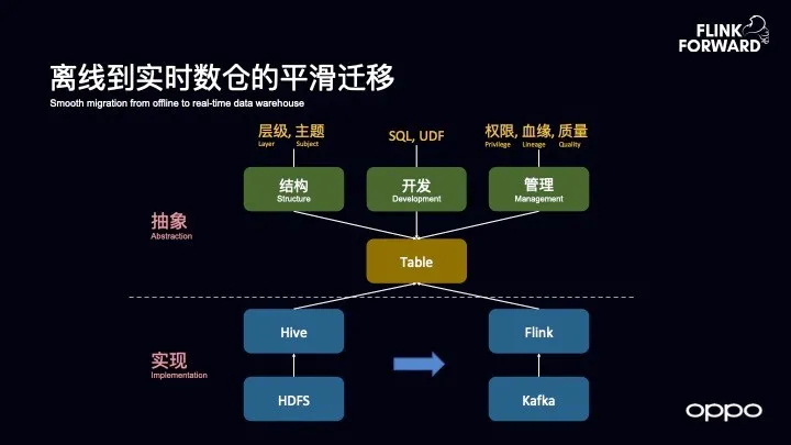 当有了对于底层逻辑的观察之后,就能够推导出顶层设计情况。OPPO 希望所设计出来的实时数仓能够实现从离线到实时的平滑迁移,之前大家如何使用和开发离线数仓,如今到了实时数仓也希望大家如何开发和使用。通常而言,当设计一款产品或者平台的时候,可以划分为两层,即底层实现和上层抽象。对于底层实现而言,可能会有不同的技术,从 Hive 到 Flink,从 HDFS 到 Kafka。而在上层抽象而言,则希望对于用户而言是透明的。