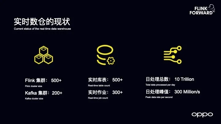 目前 OPPO 实时数仓的规模是 Flink 已经达到了 500 多个节点,Kafka 大概达到了 200 多个节点。在元数据维度,实时数据库表达到了 500 多张,实时作业大概有 300 多个。在数据规模维度,每天总数据处理量超过了 10 万亿,峰值大概超过每秒 3 亿。