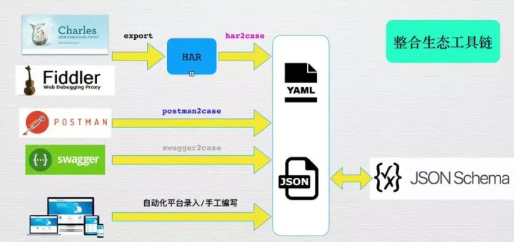 以上就是人工编写的实例,实际工作中,手动编写费时费力,于是自动生成YAML/JSON文件深入人心。你可以利用抓包工具:Charles,Fiddler,postman,用这些软件抓取数据,然后生成har文件,HttpRunner可以把这har文件转换成自己的YAML/JSON,后面会有简单例子。整个过程就像下面这幅图: