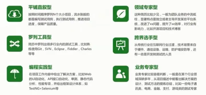 第五种就是跨界选手型。之前我们招人的时候,会有一些传统行业想要转行到互联网行业,他们的技术背景会比较专一,比如测试硬件服务器的,甚至还有一些运维想要转到测试的。对于这样的一些简历,可能会约过来聊一下,如果真的是没有这方面的人才需求,这样的简历通过率就会很低。当然说有的公司很大,那么就会把这个简历转给其他部门。