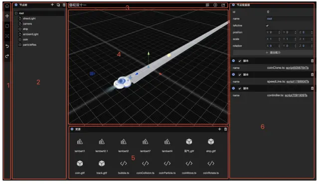 窗口 1:工具窗口,包括属性可视化操作工具(节点平移、旋转、缩放)、撤销、重做等功能。 窗口 2:场景节点树,可以可视化操作整个场景节点树,包括节点添加、删除、复制、拖拽移动等功能。 窗口 3:导航栏,展示一些项目级别的功能操作按钮,包括预览、发布功能按钮。 窗口 4:3D 场景操作视口,可视化 3D 场景操作界面,实时反馈节点以及其属性变化的渲染效果,也可通过鼠标和快捷键操作场景内容修改属性。 窗口 5:资源管理,可以添加上传资源、删除资源,供 3D 场景关联使用。 窗口 6:属性检查器,用于查看和修改节点属性、节点功能组件属性、资源属性。