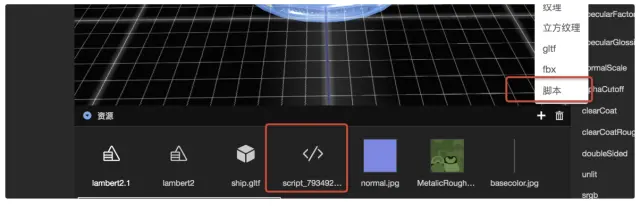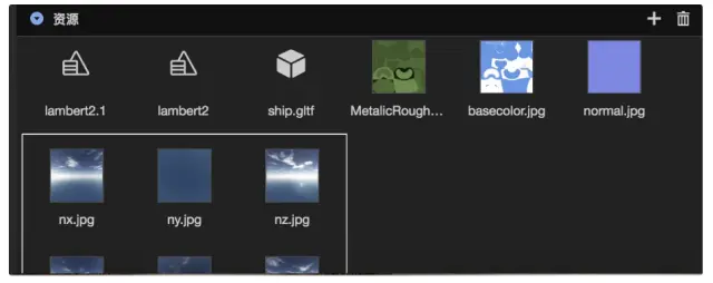 - 飞船的模型是一个 GLTF 文件,点击”资源“右侧的”+“号,上传 GLTF 文件。编辑器会自动解析并生成对应的材质。