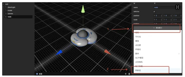 在左侧的节点树中创建一个新节点,然后添加 PBR 光的能力,这里的 PBR 光指的就是环境映射的光源。