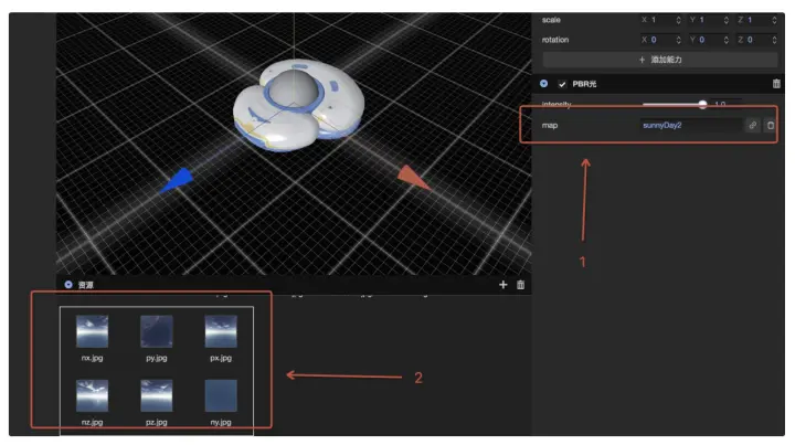 点击 PBR 光的 map 属性,选择立方体贴图(只需点击其中一张图就会默认绑定好六张纹理)。