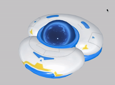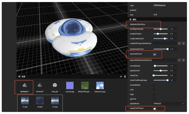 最后调整 PBR 材质的反射强度。选中”资源“区的 lambert2.1,默认是金属粗糙度模式,所以需要把 isMetallicWorkflow 取消勾选,变成高光光泽度模式。为了模拟蓝色的天空,specularFactor 的 hex 值设置为4A90E2,baseColorFactor 的 hex 值设置为 FFFFFF. 到此为止,一个具有光泽感的飞船就制作完成了~