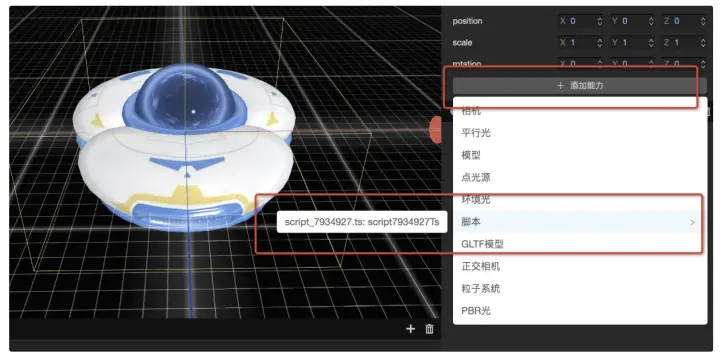 回到编辑页面,鼠标选中飞船后点击添加能力,选择我们刚才创建的脚本