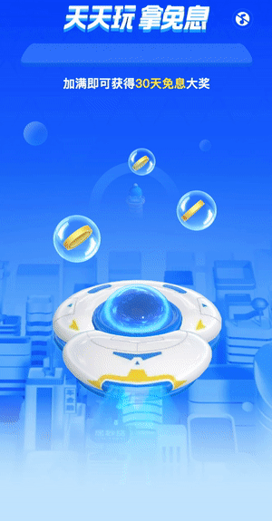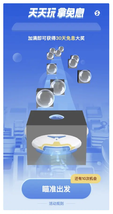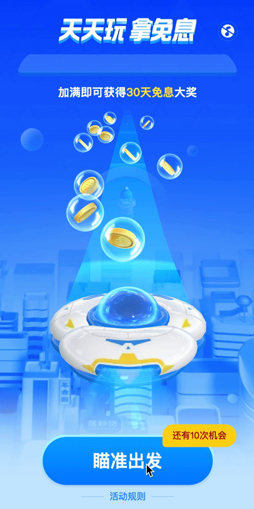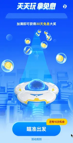 具体玩法是这样的:画面中有一只可爱的小飞船和随机数量的金币,用户看准金币移动至中间位置、连成一条线的时候,点击“瞄准出发”按钮,将飞船发射出去,飞船触碰到金币,即可获取免息天数。看看演示👇~