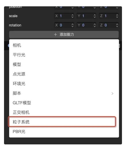 飞船的尾焰效果由两部分组成:上方有一个半透明的模型,下方是呈扇形发射的粒子系统,粒子系统可以点击右侧的“添加能力”添加。
