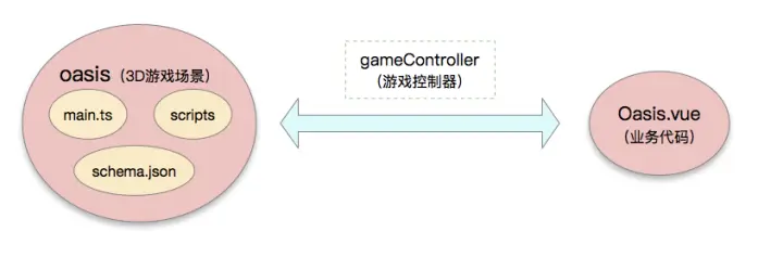 Oasis.vue 是页面中的组件,其中包含了一个 canvas 用来展示 3D 场景,可以直接调用 gameController 中的接口来操作游戏场景。