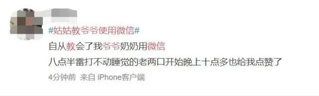 有一个长辈,我们教他 用微信 的时候告诉他,别人发了朋友圈,你 可以在底下评论。然后,他就真的开始 "评论" 别人的朋友圈,评语都是 “风趣幽默”、“优美动人”、“温馨和睦”、“风景如画” 等等。