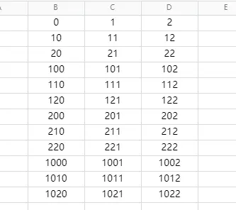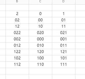 这里用三进制的形式来表示是为了方便说明问题,在正常的三进制中有三个元素0、1、2,它们所表示出来的数是这个样子的。