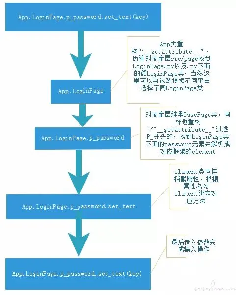 在访问类 App 属性时挡截下来,历遍对象库层找到对应元素返回对应的对象类 App.LoginPage,而对象库层都继承了BasePage 类,在 BasePage 中同样重构了"getattribute",当 App.LoginPage 对象尝试调用 click() 之类的方法时,就临时绑定 click 方法(click/swip/gettext/settext.....)。