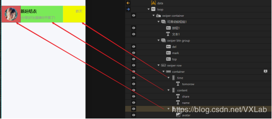 在ivx这个demo里面,是选中可滑动行添加了一个行容器,行容器中又添加三个列容器,分别展示头像,昵称消息内容和消息日期。可滑动行名字中是带着行的,而且也确实可以把它当成一个行组件看待。在内部添加组件是横向排列的,不过并不能像行组件一样设置换行以及剪切,而且他的宽高也是由父容器可滑动容器的宽高决定的。