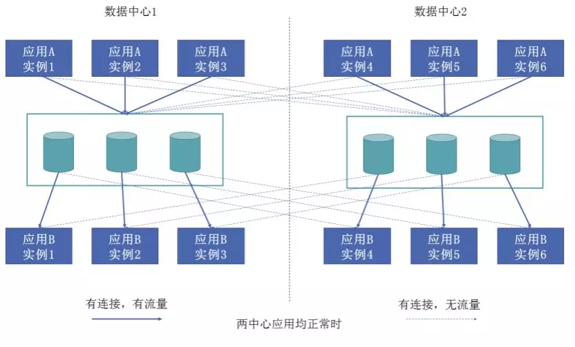 为了达到高可用和容灾的一些要求,服务会部署在至少两个数据中心。当一个数据中心有某个服务全部故障不可用时,其他数据中心正常的实例能自动接管这部分流量。在部署的时候,请求方和服务方在两个数据中心都会部署,当两中心都正常时,请求方会依照服务就近的原则,将请求发到同 IDC 内,跨 IDC 只通过心跳维持连接。服务方订阅时优先监听同 IDC 内的队列。